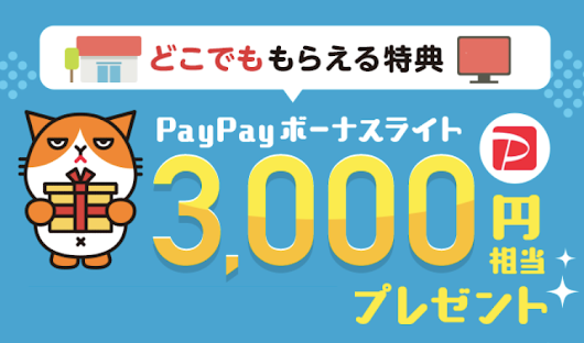 「どこでももらえる特典」に事前にエントリーしておくだけで、3,000円相当のPayPayがもらえます。